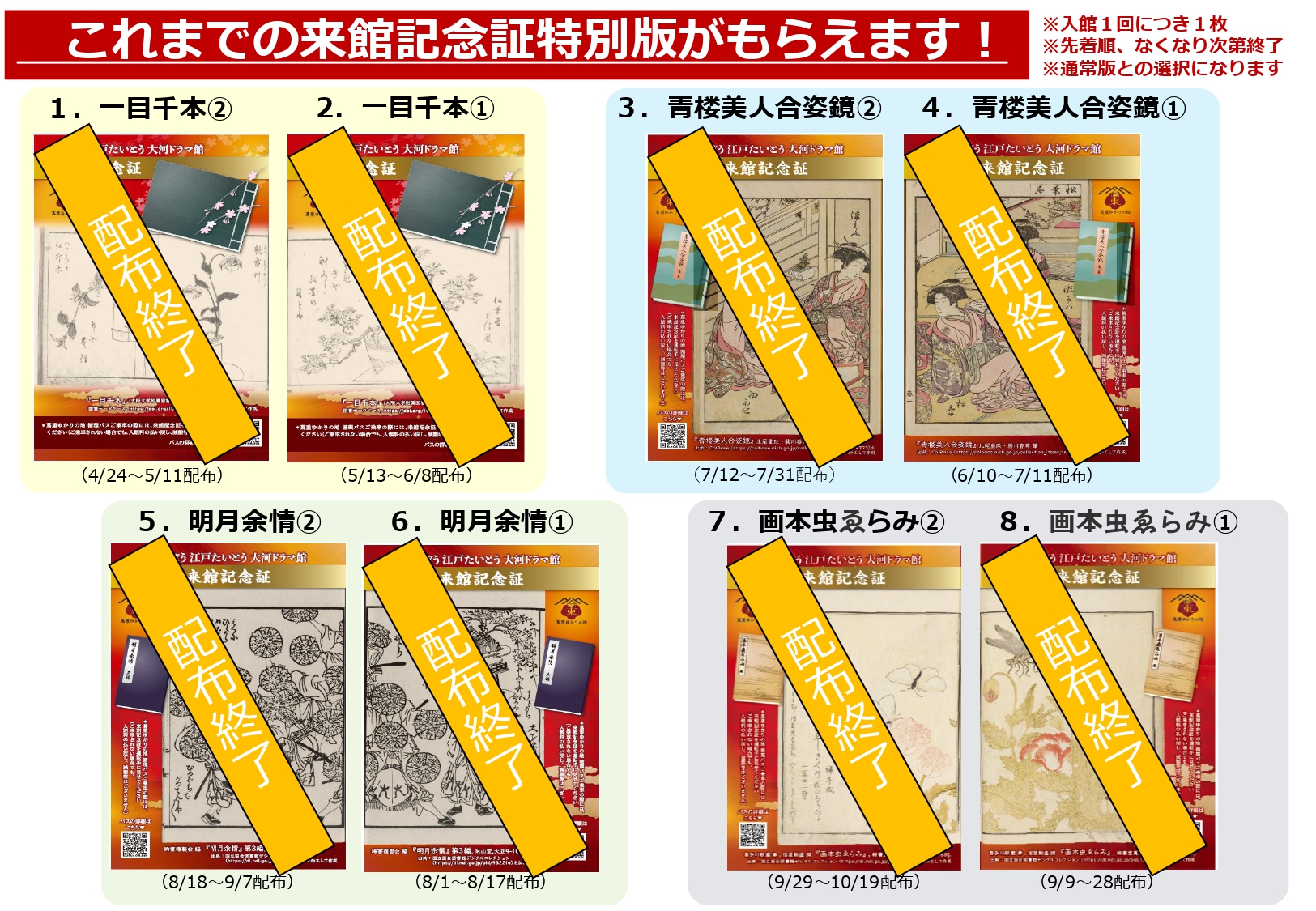 べらぼう 江戸たいとう 大河ドラマ館では、10月20日(月)から、入館時にこれまで配布した来館記念証特別版または来館記念証通常版からお好きなものをお選びいただけます。
