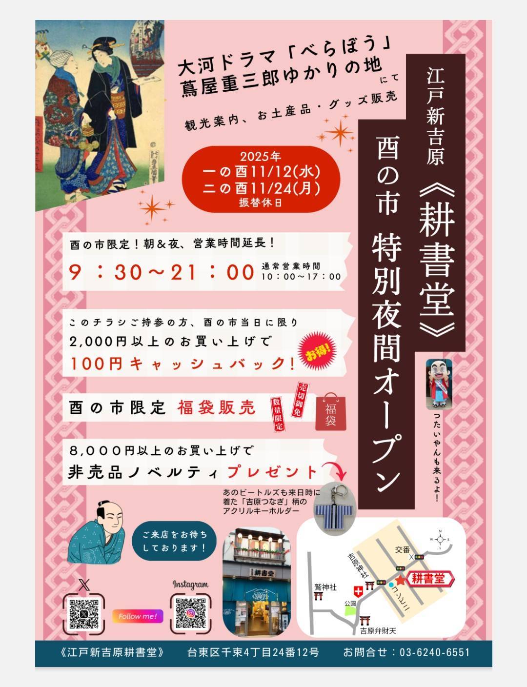 【江戸新吉原耕書堂】酉の市に合わせて営業時間を延長します!