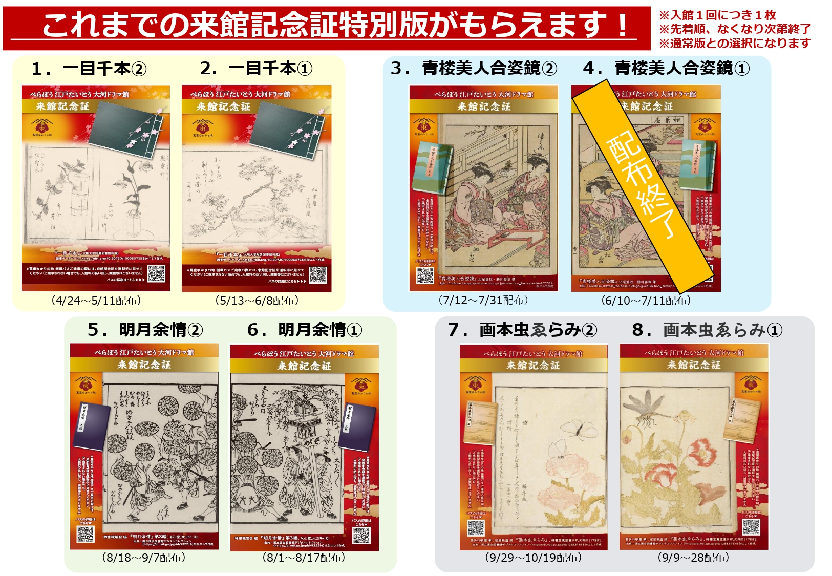 べらぼう 江戸たいとう 大河ドラマ館では、10月20日(月)から、入館時にこれまで配布した来館記念証特別版または来館記念証通常版からお好きなものをお選びいただけます。